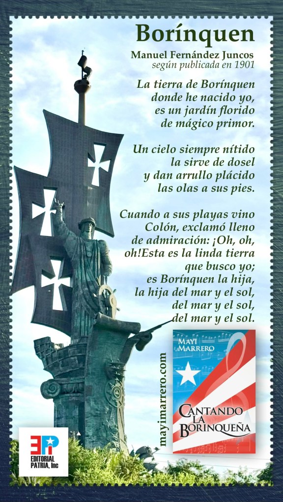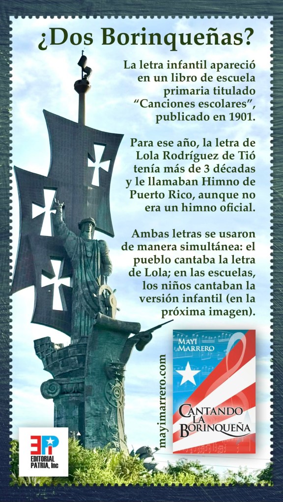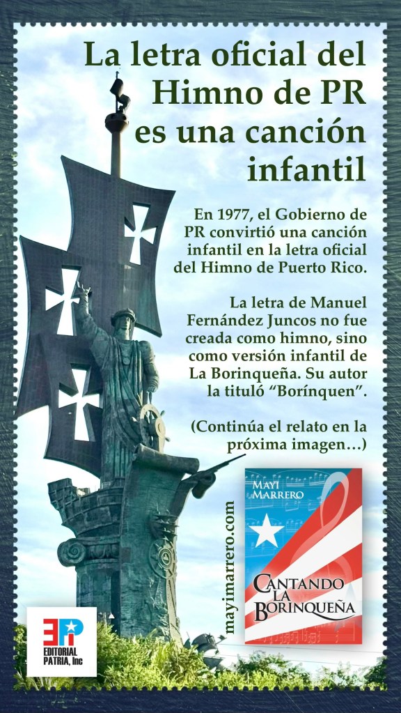 Este artículo está basado en datos recopilados del libro Cantando La Borinqueña de Mayi Marrero (Editorial Patria, 2024) en el que encontrarás la historia completa de La Borinqueña, junto a más de 25 versiones diferentes de su letra. El libro indaga en los orígenes de cada versión encontrada (romántica, revolucionaria, satírica, política, triunfal, etc.) y dedica todo un capítulo a la historia de la letra infantil de Fernández Juncos y a sus diferentes variaciones y traducciones. Incluye otros capítulos que brindan detalles de cómo fue el proceso legislativo que convirtió a La Borinqueña en el Himno del Estado Libre Asociado de Puerto Rico y cómo se realizaron las enmiendas que ha recibido la Ley del Himno a lo largo del tiempo. El libro también presenta evidencia de las motivaciones puramente políticas de dichas decisiones, así como las reacciones del pueblo. Más detalles en este enlace.