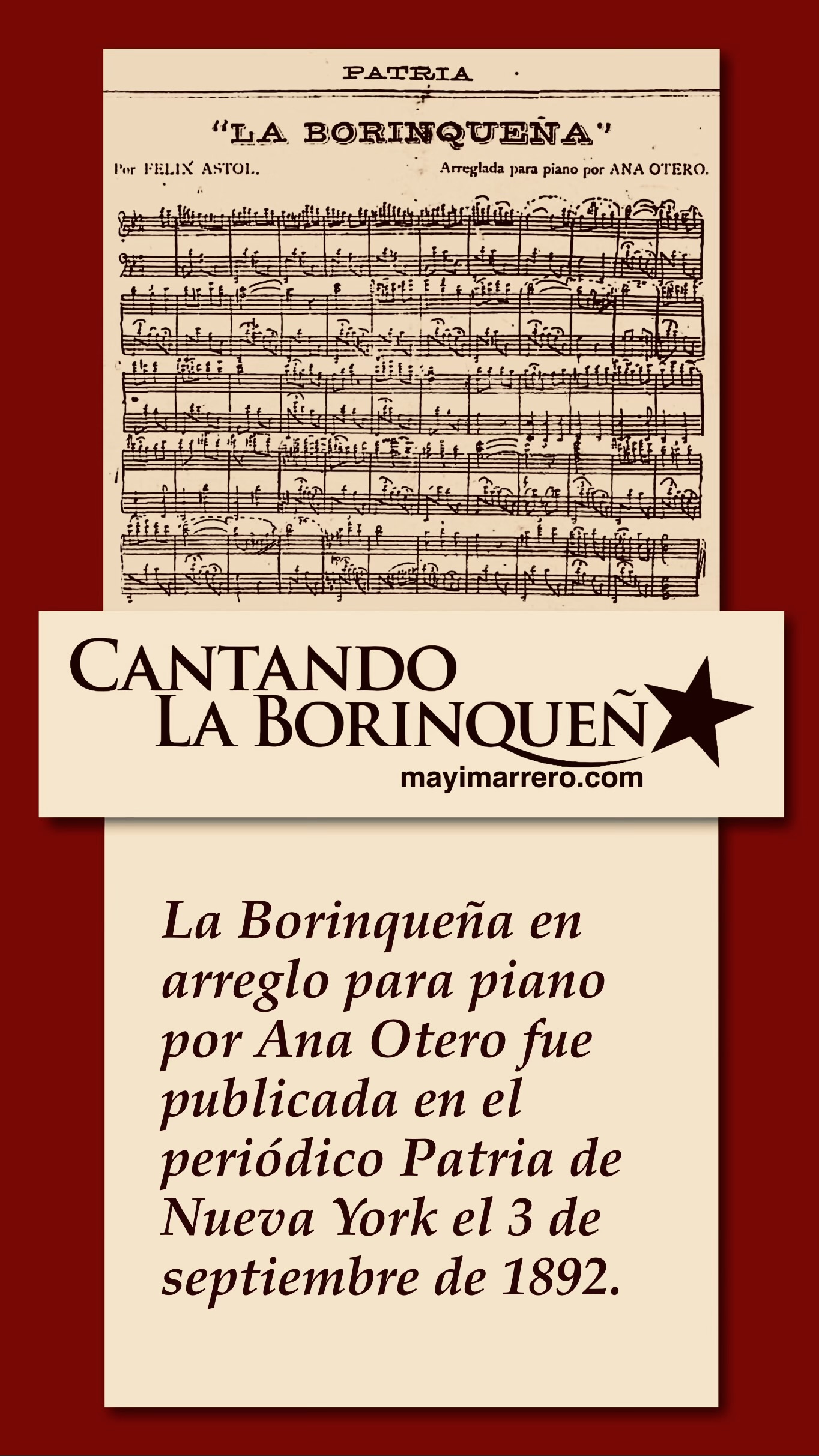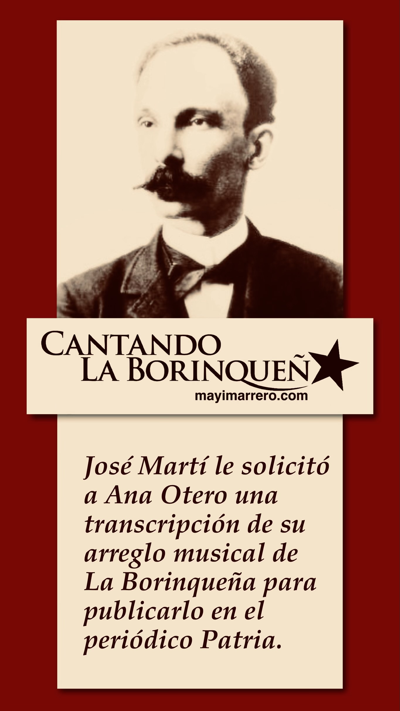 Martí se desbordó en elogios para Ana Otero a la vez que le solicitó una partitura de La Borinqueña para publicarla en el periódico Patria, publicación que editaba en Nueva York. «Ya publicaremos esa danza heroica, esa Borinqueña que conmueve al patriota puertorriqueño…», expresaba José Martí en el periódico Patria del 20 de agosto de 1892.