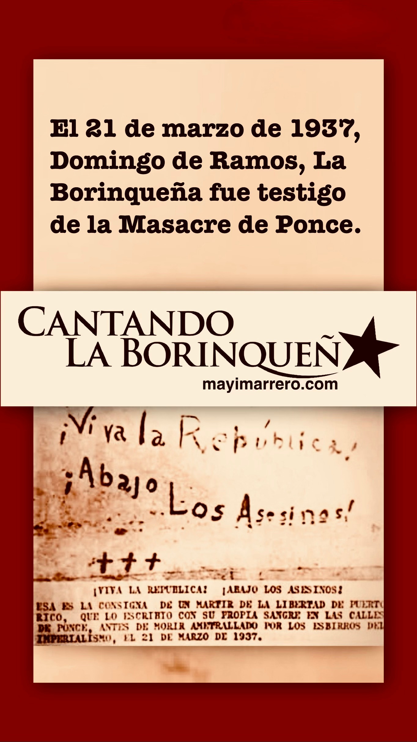 La Borinqueña fue testigo del acto más sangriento del que fue víctima el nacionalismo puertorriqueño. El 21 de marzo de 1937, Domingo de Ramos, un grupo de nacionalistas se aprestaba a marchar por las calles de Ponce para conmemorar el aniversario de la Abolición de la Esclavitud y reclamar la liberación de varios prisioneros políticos, entre ellos Pedro Albizu Campos. Lo que debió ser una manifestación pacífica se convirtió en la Masacre de Ponce que dejó el saldo de 19 muertos –17 de ellos, nacionalistas– y más de 150 heridos.