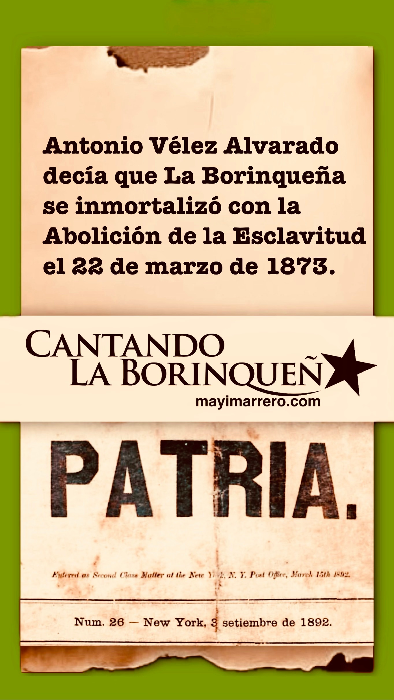 La escena descrita por Vélez Alvarado en el periódico Patria (Nueva York) coincide con lo ocurrido en Ponce en marzo de 1873. Tras un emotivo discurso de Román Baldorioty de Castro, la muchedumbre salió en procesión espontánea para celebrar la abolición de la esclavitud. En San Juan pasó algo similar. El gobernador Primo de Rivera se dirigió al público desde el balcón de la Intendencia. Luego se escuchó “un viva estentóreo a Puerto Rico libre, y la música con el coro del pueblo rompió a tocar La Borinqueña”.*