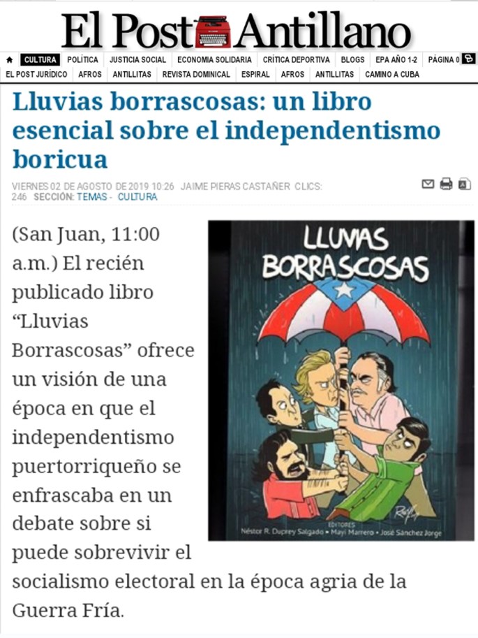 Lluvias borrascosas, editado por Néstor R. Duprey Salgado, Mayi Marrero y José Sánchez Jorge, se lanzó oficialmente el 11 de julio de 2019, en el Ateneo de Puerto Rico, Viejo San Juan. El libro tiene como objetivo principal responder si era posible para la izquierda conquistar el poder y llegar al socialismo por la vía electoral. Puerto Rico no fue excepción a la búsqueda de respuestas a esa interrogante de eco continental. En el independentismo electoral puertorriqueño, se reproducirá ese debate durante los años finales de la década del sesenta hasta los postreros de la Guerra Fría y del largo siglo XX.